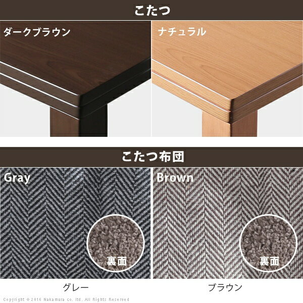 【セット構成】 こたつ本体x1 掛布団x1 【カラーバリエーション】 ■こたつ本体 ダークブラウン ■掛布団 ブラウン・グレー 【仕様】 ■こたつ本体 天板:繊維板 脚部:天然木(ラバーウッド) フラットヒーター130W、中間スイッチ式) ◎完成品 ■掛布団 表地:ポリエステル53%・綿39%・レーヨン8% 裏地:ポリエステル100%(シープボア) 中綿:ポリエステル100% 【サイズ】 ■こたつ本体 幅90x奥行60x高さ40cm 重量:約15.5kg 本体高さ:35/40cm 天板サイズ:幅90x奥行60cm・厚み23mm・約5kg 脚間(長手/短手):75/45cm 中天板下高さ:30/35cm ■掛布団 サイズ:210x190cm・中綿:約680g 株式会社ナカムラ(I-3302506)こたつ テーブル 折れ脚 スクエアこたつ 〔バルト〕 90x60cm+ヘリンボーン織り掛布団 2点セット セット 布団 洗える コタツ リビングテーブル 折れ脚 折りたたみ 継ぎ脚 節電 おしゃれ 木製 シンプル あったか【注意事項】こちらのページの商品は、メーカー直送の商品となります。
